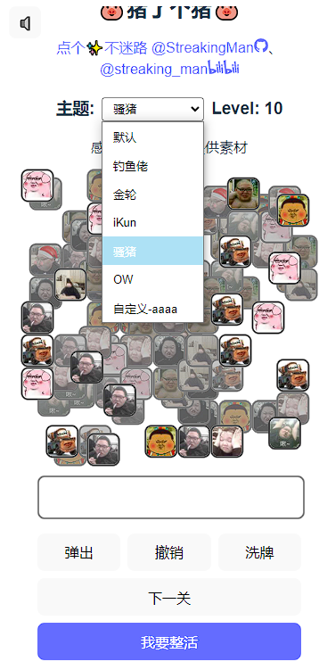 和其它的高仿版本不同的是,有解的羊了个羊难度更接地气,共有 50 关可以直接跳。并且还包含很多主题版本,比如 PDD(骚猪)、金轮、 ikun(露出黑脚)、 OW主题等