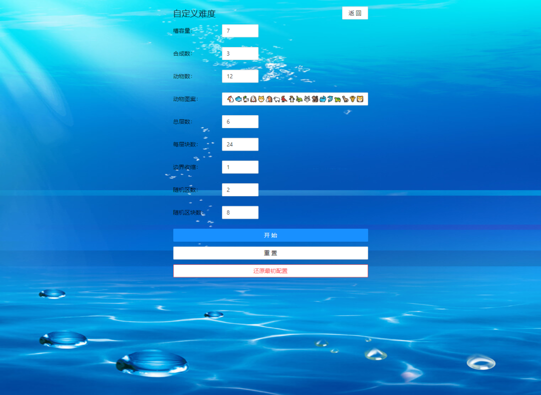 鱼了个鱼包含简单、中等、困难、地狱、天狱模式。同样你还能自定义游戏的设置,你可以通过自定义槽容量、合成数、随机区数等设置来自定义一个游戏。