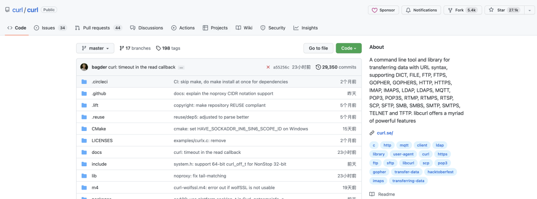 curl 大家应该非常熟悉,是工作中常用的命令行工具,用来请求 Web 服务器。在 GitHub 上获得了 27k 的 Star。