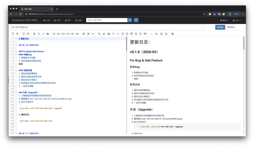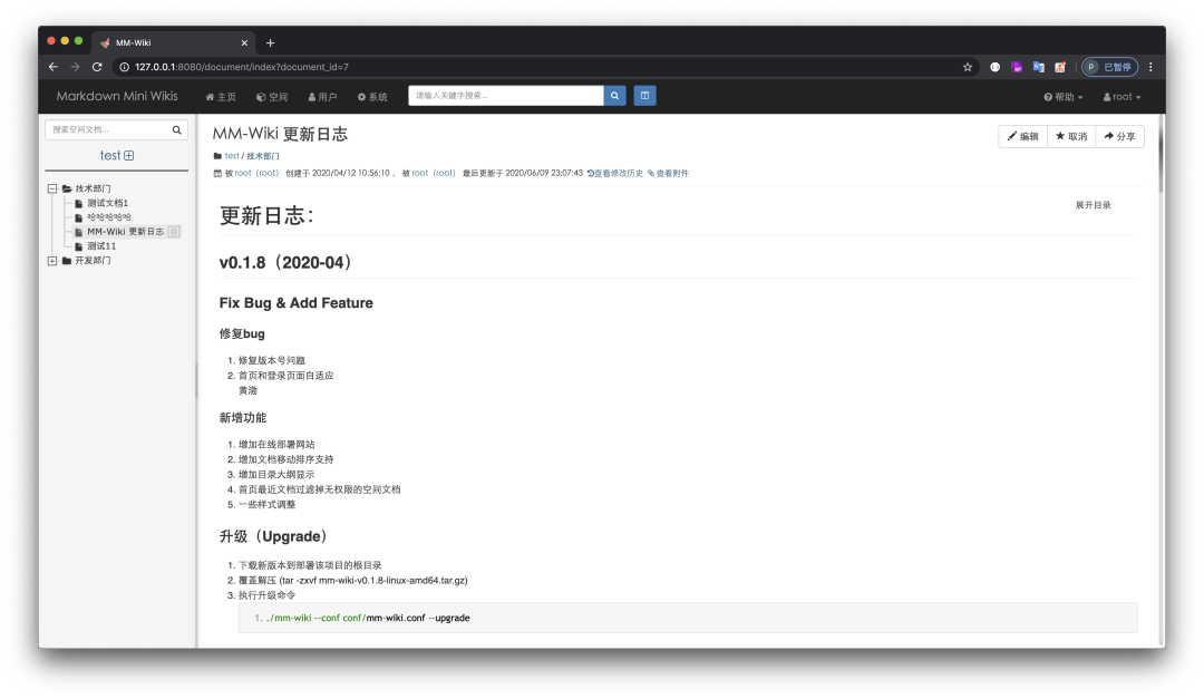 MM-Wiki是一个基于 Golang 的轻量级的企业知识分享与团队协同软件,可用于快速构建企业 Wiki 和团队知识分享平台。部署方便,使用简单,支持 markdown 语法写作,支持附件上传。帮助团队构建一个信息共享、文档管理的协作环境。