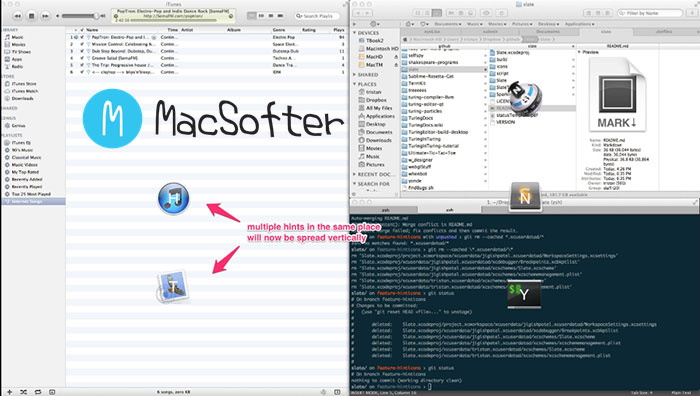 Divvy、SizeUp 都是强大的分屏工具,Slate 是其开源的替代品。你可以通过 Slate 实现分屏和窗口股那里,支持用 JavaScript 写配置和自定义窗口布局。你可以在主显示屏写代码,左边显示器看文档、查资料,并通过窗口固定在屏幕的左右两侧。有了 Slate 你不用一个个固定窗口的位置,只需要配置快捷键一键搞定。