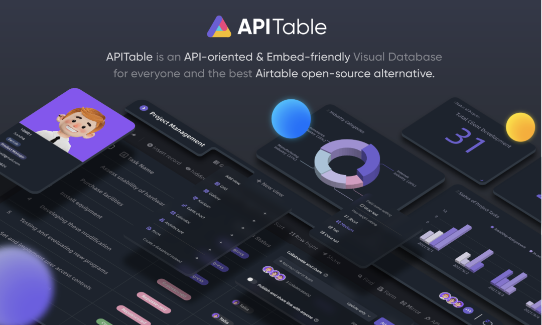 APITable 一个面向 API 的低代码平台,用于构建协作应用程序。开源两天便斩获 1.1K 的 Star。你可以访问 gitpod.io 体验 APITable,或者去开源项目主页浏览项目详情。