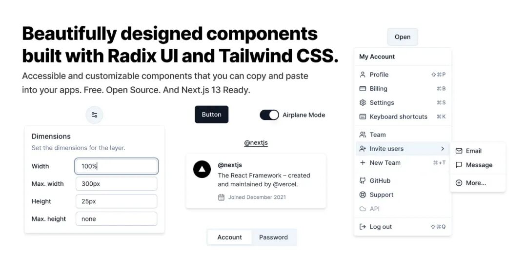 使用 Radix UI 和 Tailwind CSS 构建的设计精美的组件,支持 Toast、Toggle、Toggle Group、Toolbar、 Navigation Menu。