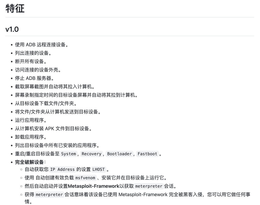该工具可以使用Metasploit-Framework和ADB在目标设备上自动创建、安装和运行payload,一键完全破解 Android 设备。