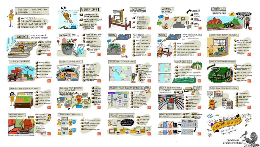 物联网基础课程共 24 节课程,除了讲解 IoT 相关的内容,还包含一些项目和案例。这些项目涵盖了食物从农场到餐桌的旅程。这包括农业、物流、制造、零售和消费者,这些都是物联网设备使用比较热门的行业领域。
