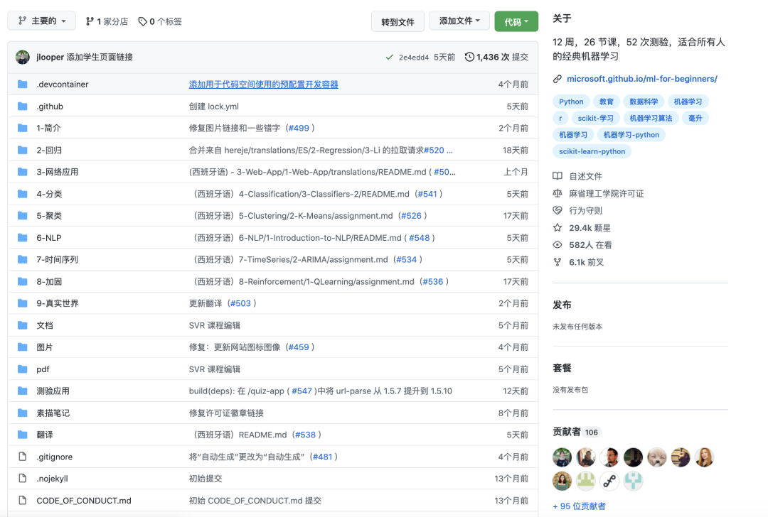 这个获得 44k 的 Star 的开源项目,时 Microsoft 的 Azure Cloud Advocates 出品的机器学习课程( 26 节课)在这个开源课程中,你会学习到经典机器学习的内容,主要使用 Scikit-learn 学习机器学习,并且很少设计深度学习的相关知识。