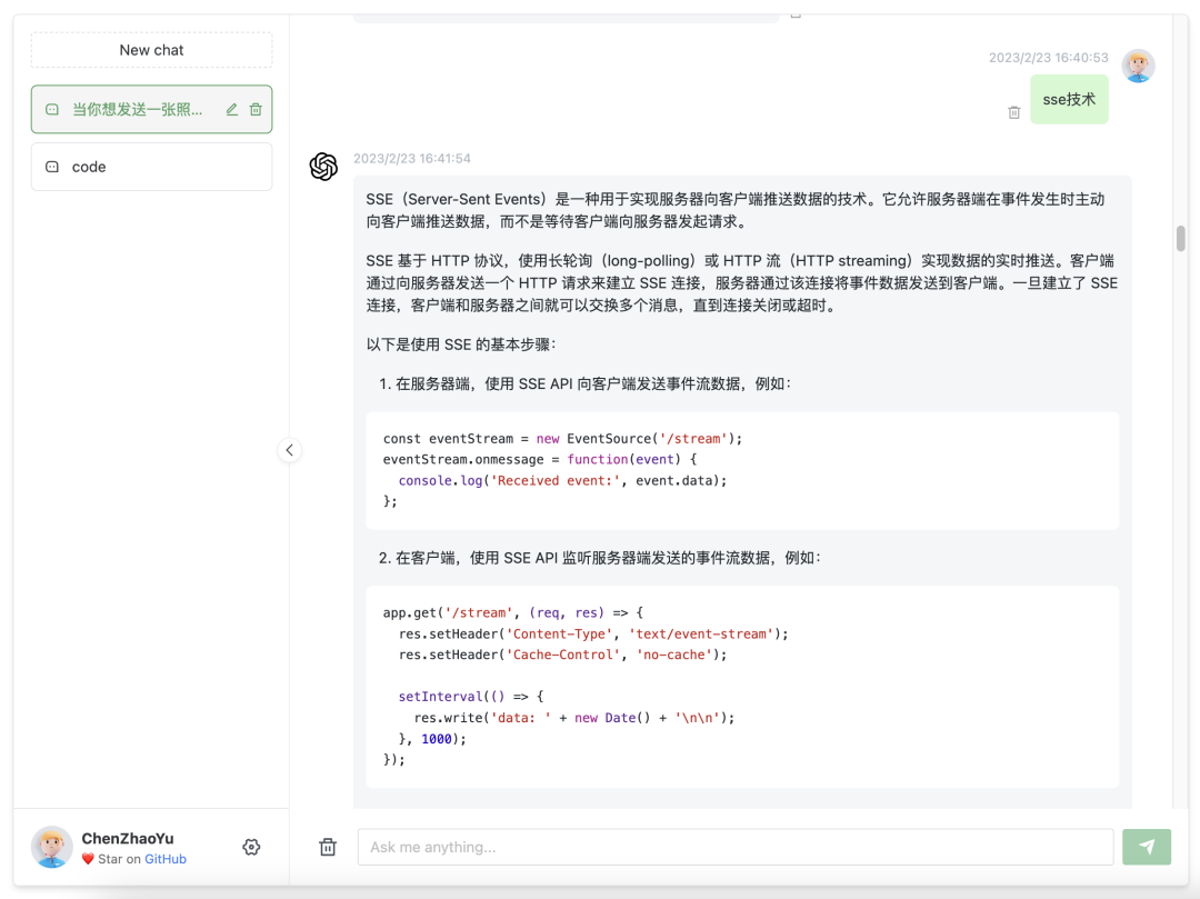 这个开源项目是一个基于 ChatGPT 的聊天机器人的 Web 界面,用于展示如何使用 ChatGPT 进行聊天。