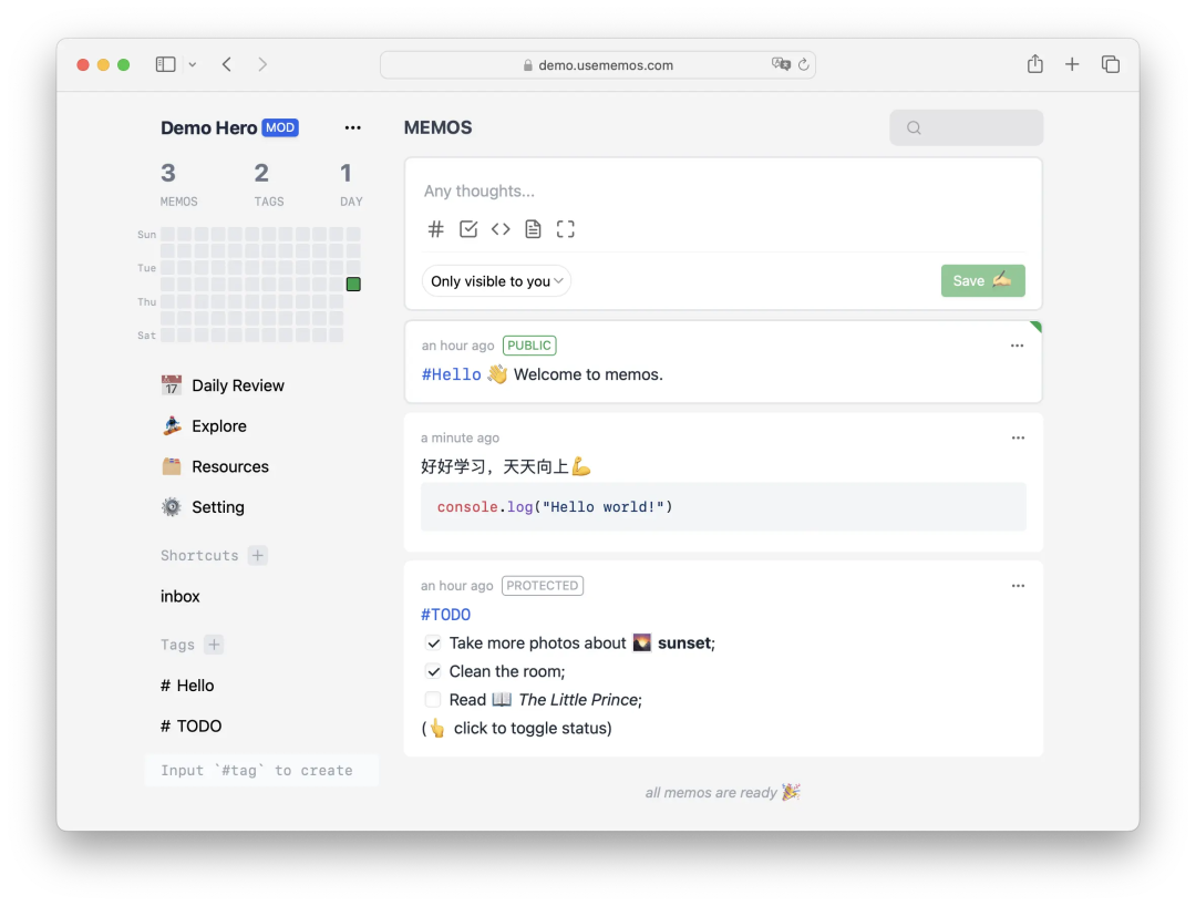 memos 是一个开源的个人笔记项目,旨在提供一个简单、易用和可扩展的笔记应用程序。该项目包含了笔记的基本功能,如创建、编辑、删除笔记,以及笔记的分类和搜索功能等。