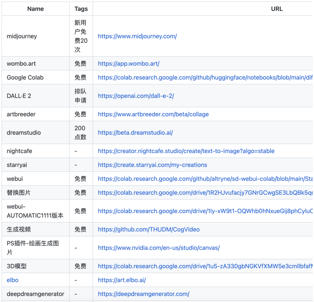 比如如下就是盘点的国外 AI 绘画的相关平台: