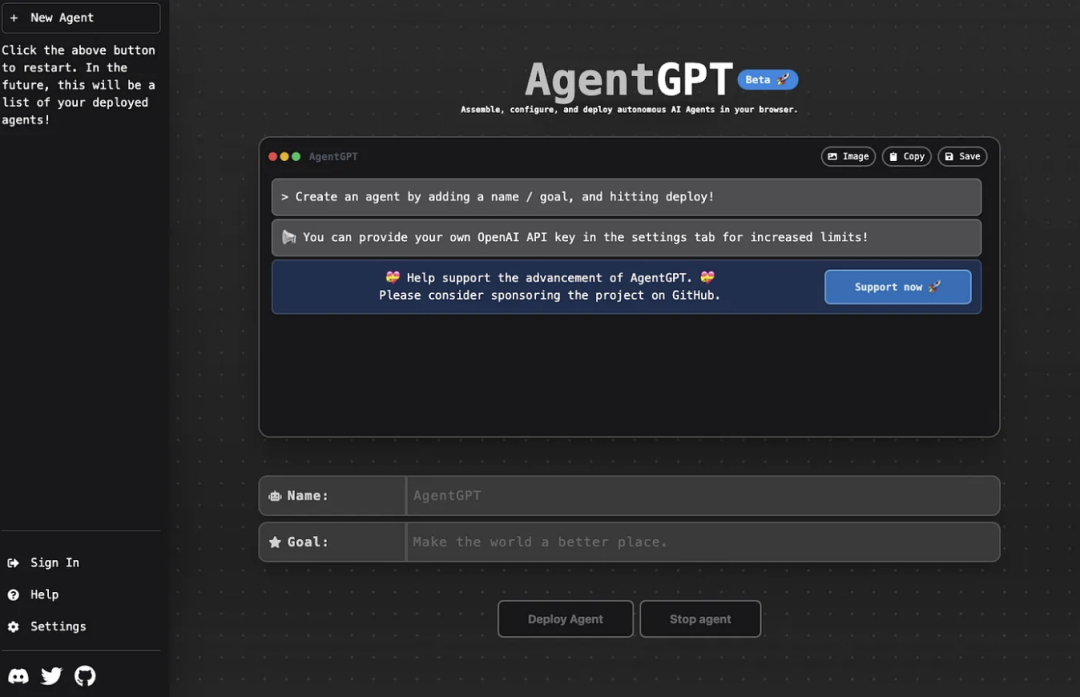 除了 Auto-GPT,还有一个像突破人工智能边界的开源项目:AgentGPT ,这个被誉为网页版的 Auto-GPT,无需安装可以直接使用。