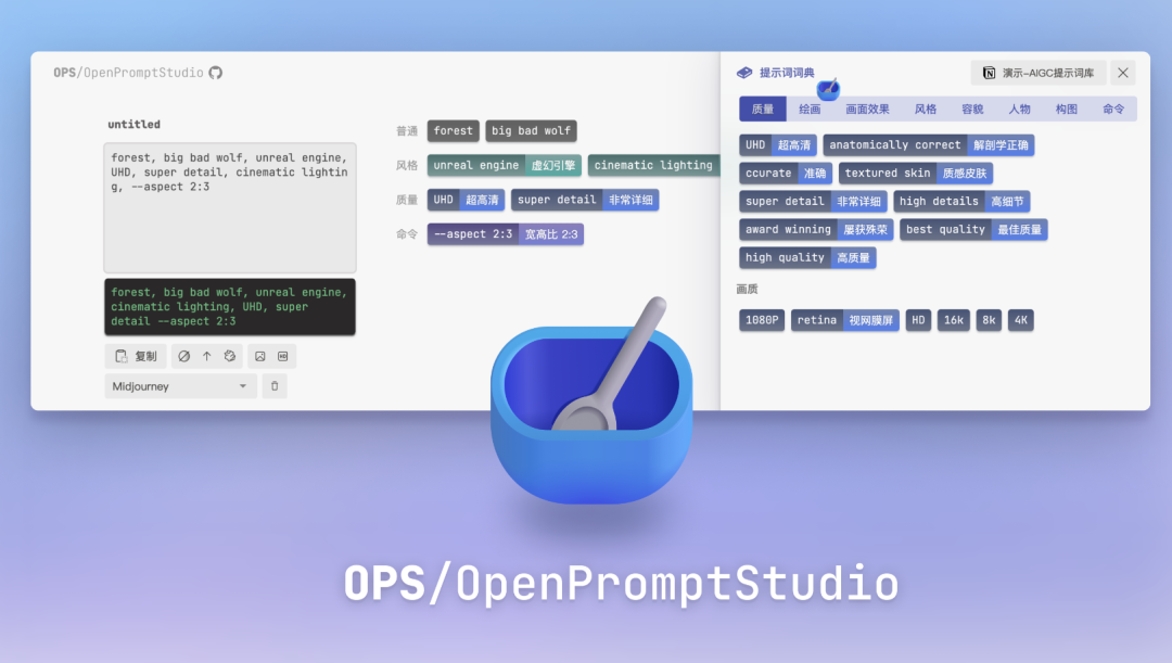 使用 AIGC 工具时常常需要输入提示词,这个开源项目可以把 AIGC 提示词可视化并提供编辑功能的工具,支持 Midjourney