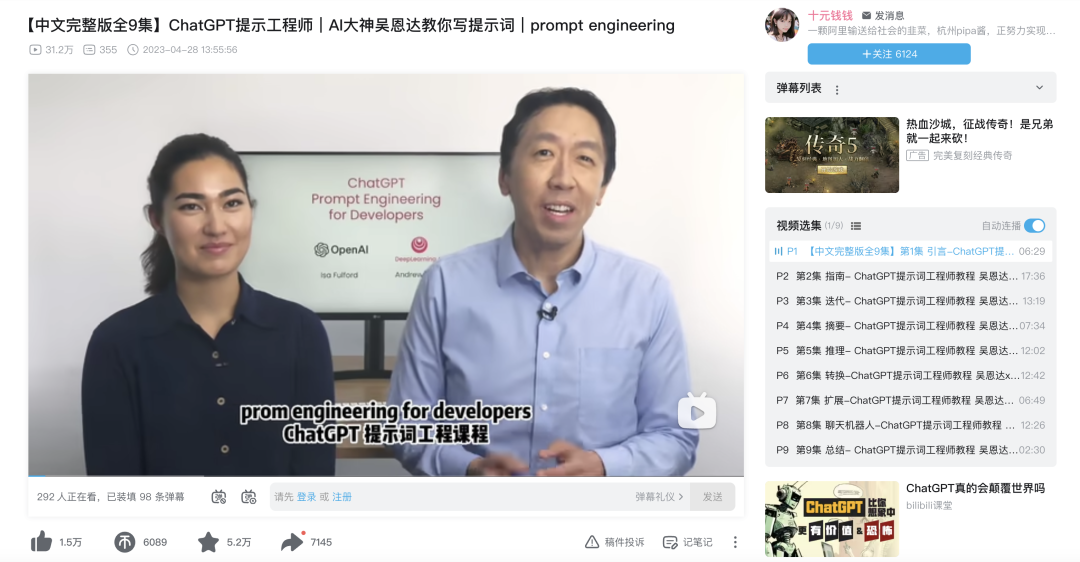 该课程除了发布在官方网站 learn.deeplearning.ai,还有 AI 爱好者上传到了 B站 ,并配上了中文字幕,非常贴心。