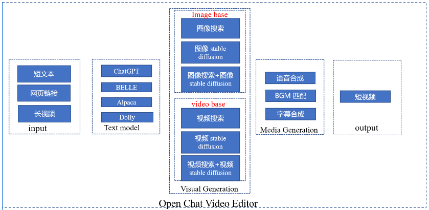 如下图是技术框架图:整体流程是将短文本输入到模型,来生成文案。通过图像搜索、图像 AI 生成技术来寻找配图,通过视频搜索、视频生成等技术来找合适的视频片段,最终通过语音合成、BGM 匹配、字幕合成打造一个短视频作品。