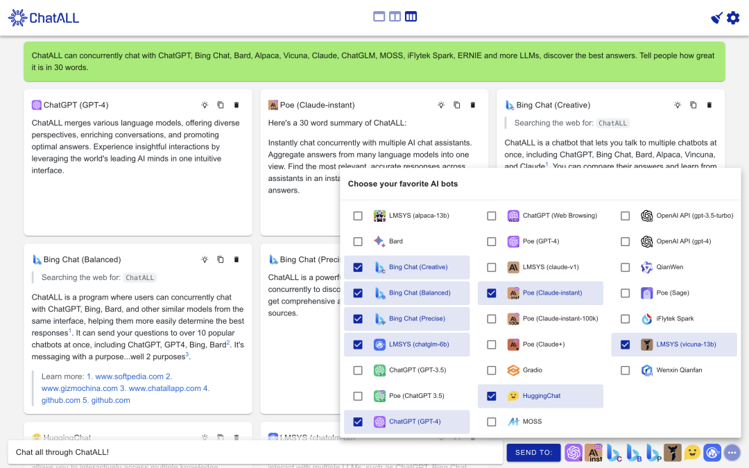 这个开源项目就集成了目前主流的 AI 机器人,通过和多个机器人对话的方式,挑选最符合你心意的答案。