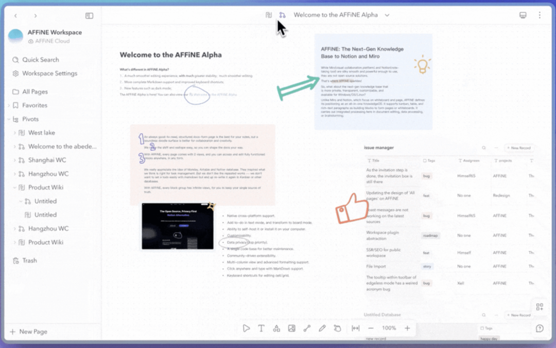 AFFINE 是 Notion、Miro 等知识库产品的开源替代品,目前已经获得了近 20k 的 Stark。通过 AFFINE 你可以进行写作、绘画、计划管理。