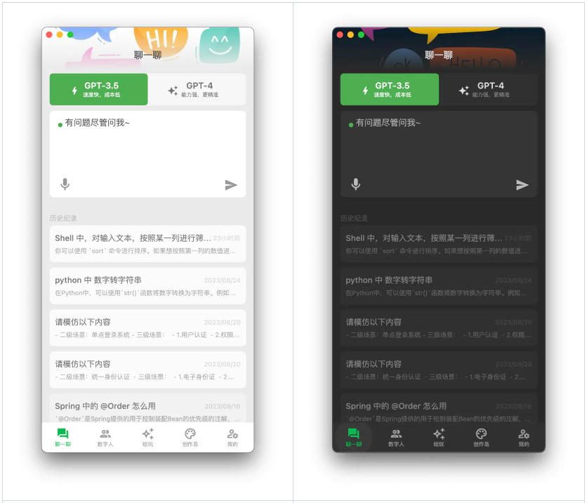 该开源项目集成了主流的大语言模型、绘图模型,基于Flutter开发,支持问答聊天、文生图、图生图、超分辨率等等功能。
