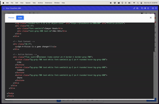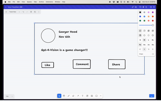 其工作原理是将当前画布的 SVG 转换为 PNG,并将该 PNG 发送到 gpt-4-vision,要求返回一个包含 Tailwind 样式的单个 HTML 文件。