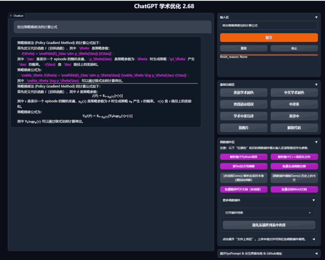 这个开源项目是名为 gpt_academic 的学术工具。它提供了多种功能和插件,使用户能够进行学术论文的翻译、润色、代码解释等操作。这些功能包括: