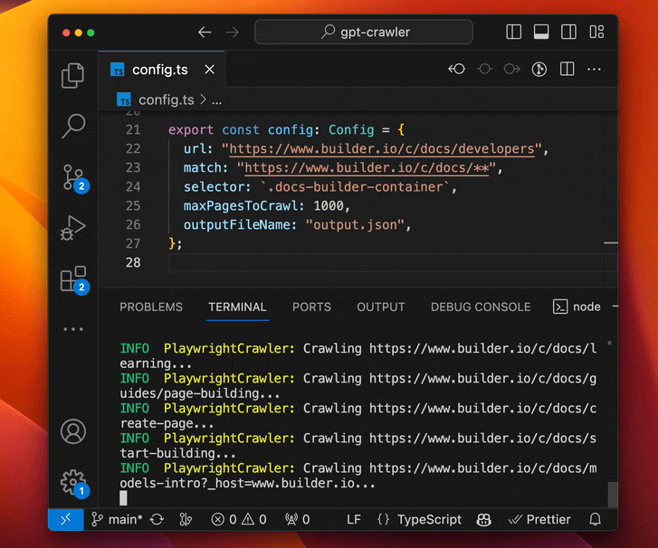 项目展示了如何使用爬虫从指定 URL(例如 Builder.io 的文档)进行爬取,配置爬虫参数,比如 URL,选择器,最大爬取页面数等参数。运行后就能爬取该知识网站的内容,输出 Json 文件。
