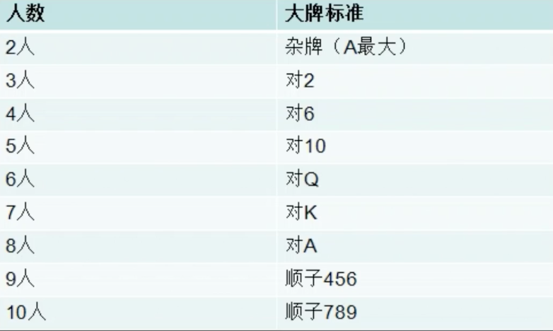 这个表怎么看呢?我举个例子,如果你是四人局,你的牌是对三,那么你的胜率是对二和对五之间,也就是说你的胜率为 41% ~ 48%,大约 45% 左右。