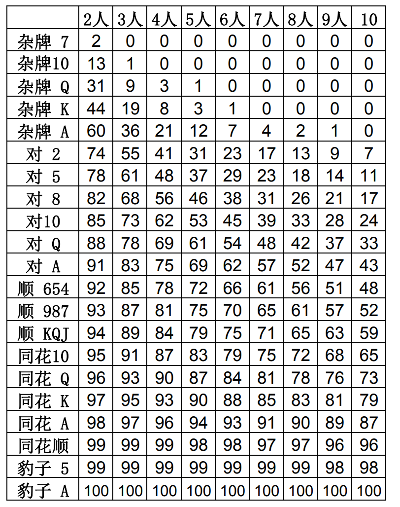 可以看到,如果大于 9 个人,必须得是顺子在才算大牌了,只有到达顺子胜率才能到 50 %,看来还是人多了精彩。
