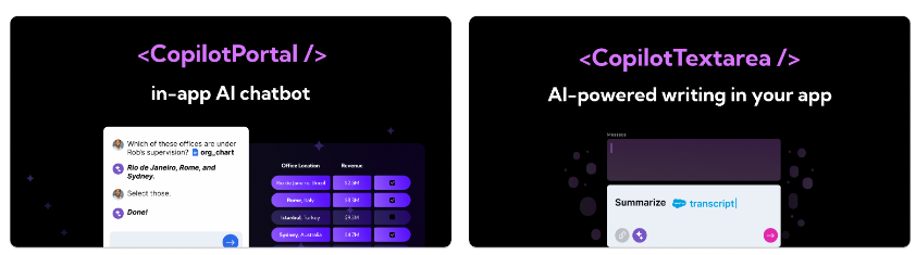 CopilotPortal:构建应用内 AI 聊天机器人,可以根据当前的应用状态并在应用内采取行动。AI 聊天机器人可以与应用的前端和后端进行交互,也可以通过插件与第三方服务(如 Salesforce、Dropbox 等)进行交互。