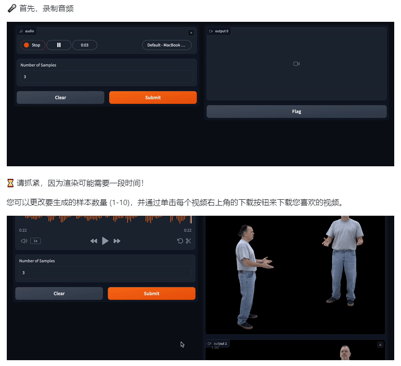 这个项目还提供了一个简单的 gradio 演示,你可以录制音频并选择你想要生成的样本数量。此外,你可以在这个项目的 发布页面 下载数据和模型。