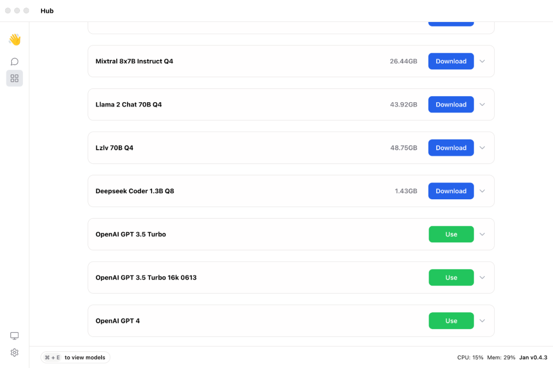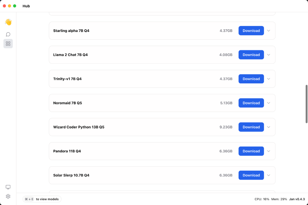 Jan 有一个 Hub 模块,里面提供了 20 个大模型可以下载,在这里你可以选择你的客户端想要使用的大模型。