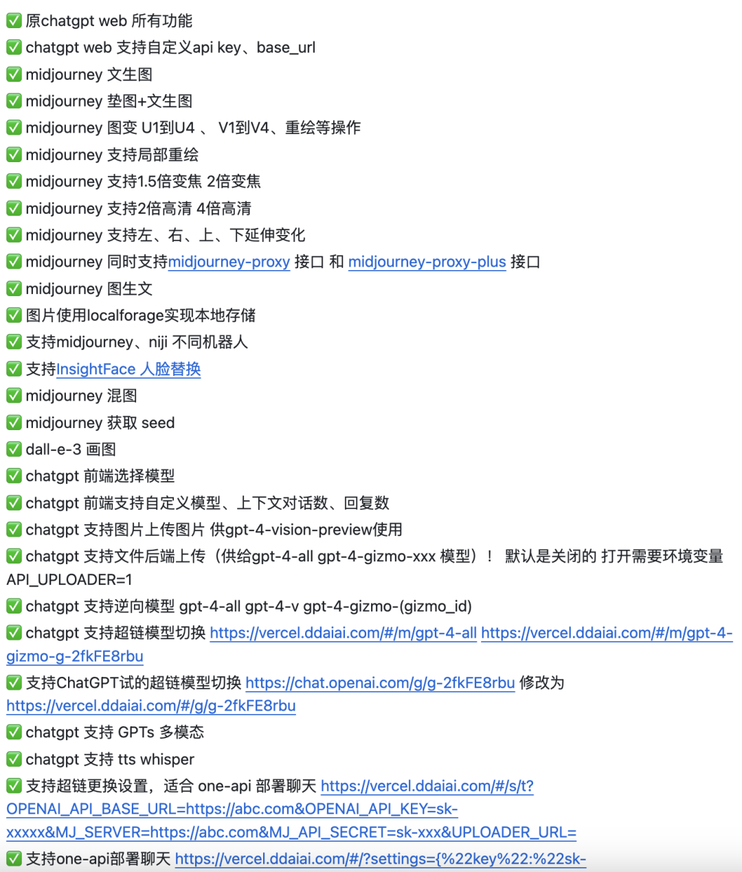 部署后,可以在基于该开源项目体验 ChatGPT、Midjourney 的功能。如下是该项目支持的功能: