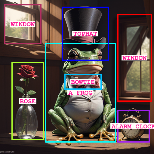 比如你在一个白色的画布不同的位置框了7个框,并在不同的框设定了内容:窗户、玫瑰、青蛙、帽子等等,最终根据你标注的位置和提示,会生成如下的图片。