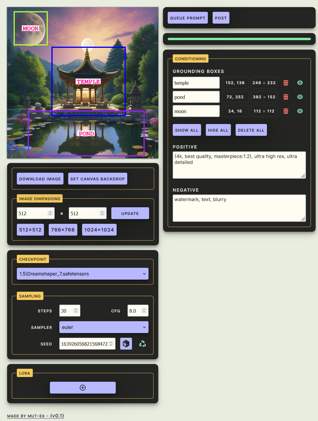 这个开源项目叫做 GLIGEN GUI,是一个使用 ComfyUI 作为后端的直观图形用户界面。GLIGEN 是一种新颖的方式,你可以框出一个区域然后指定这个区域的内容,生成更符合自己意愿的图像。