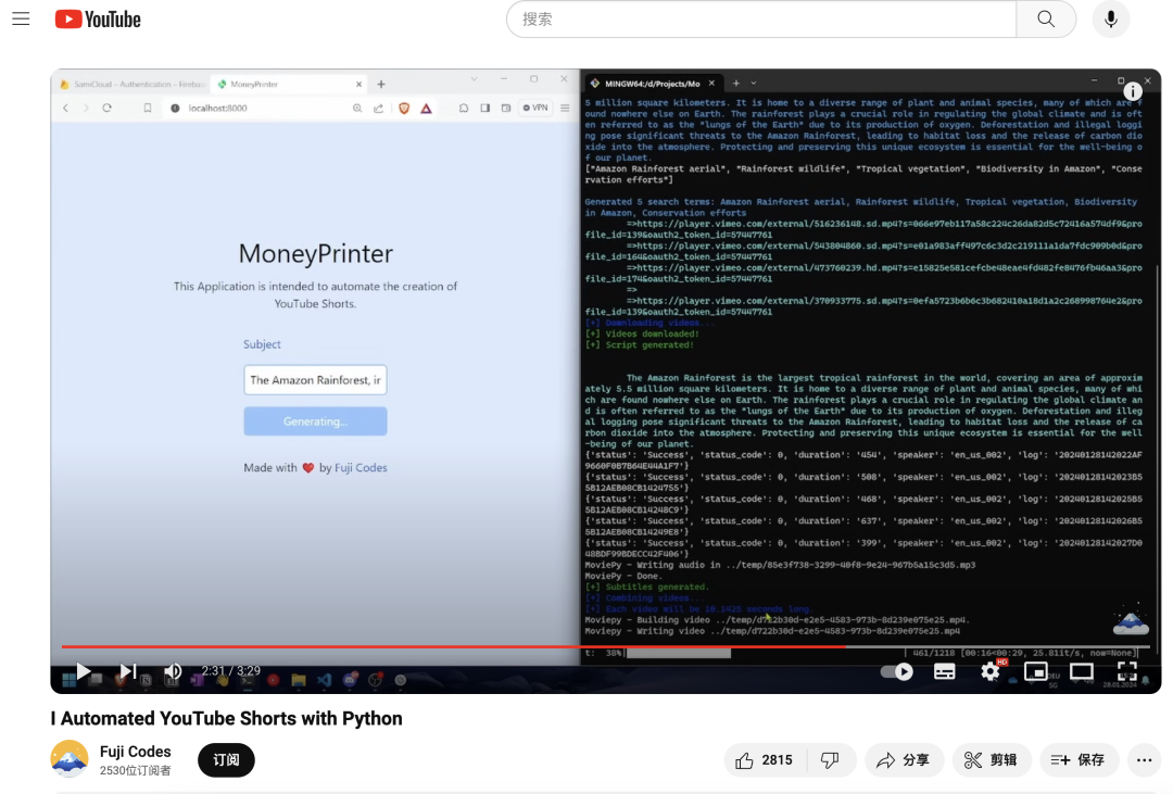开发者在 Youtube 上发布了一个讲解视频,搜索关键字观看:I Automated YouTube Shorts with Python 即可。