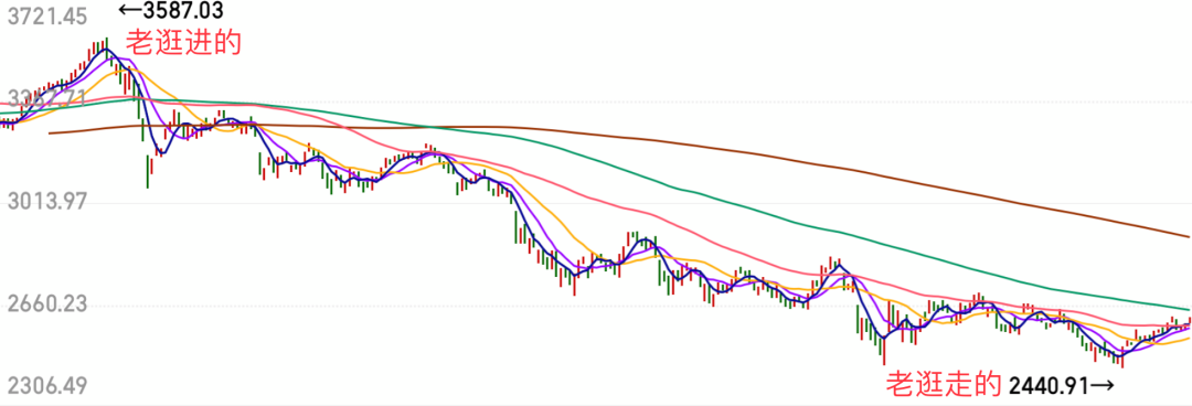 几根大阴线把我搞得血本无归,心想着刚入股市还没看懂 K线图,如果我就割肉,心有不甘,便一直拿着。终于等跌倒 2400 点左右的时候抗不住了,割肉止损。