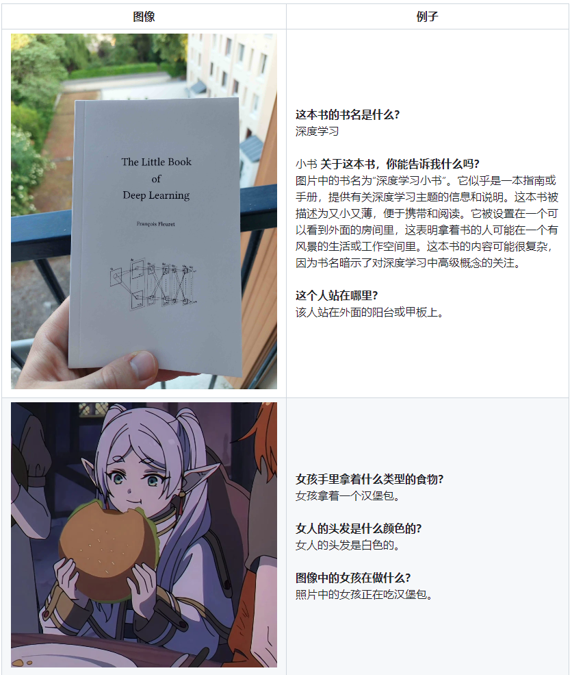 该模型可以对图像进行描述,例如识别图书的标题,描述图书的内容,识别人物的位置,识别食物类型,识别头发颜色,描述人物在图像中的行为,识别交通工具的颜色,描述交通工具在图像中的行为,识别图像中的公共交通工具类型,描述女孩在看什么,描述镜子中的女人在做什么,推测狗的攻击行为的可能原因,识别图片中的狗的种类。