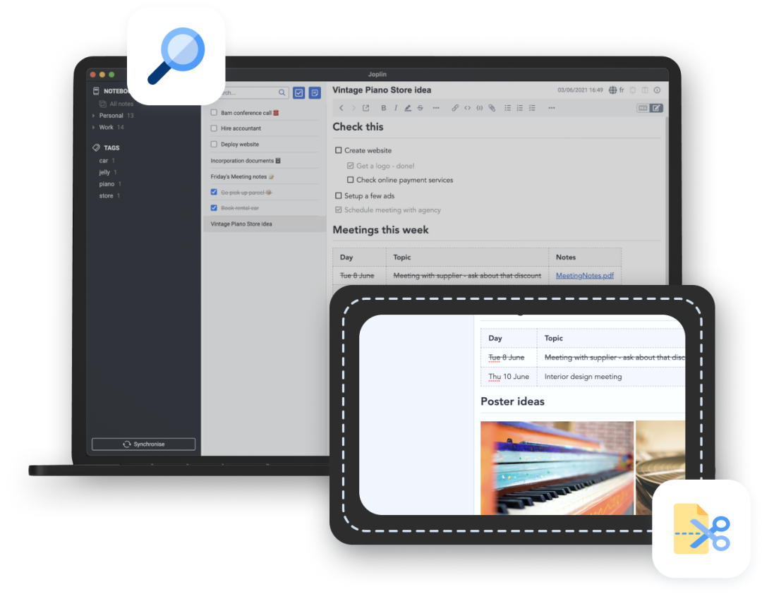 Joplin 支持从 Evernote 导入笔记,包括格式化内容、资源和元数据。此外,它也支持纯 Markdown 文件的导入,这为用户从其他笔记应用迁移到 Joplin 提供了便利。搜索与定制
