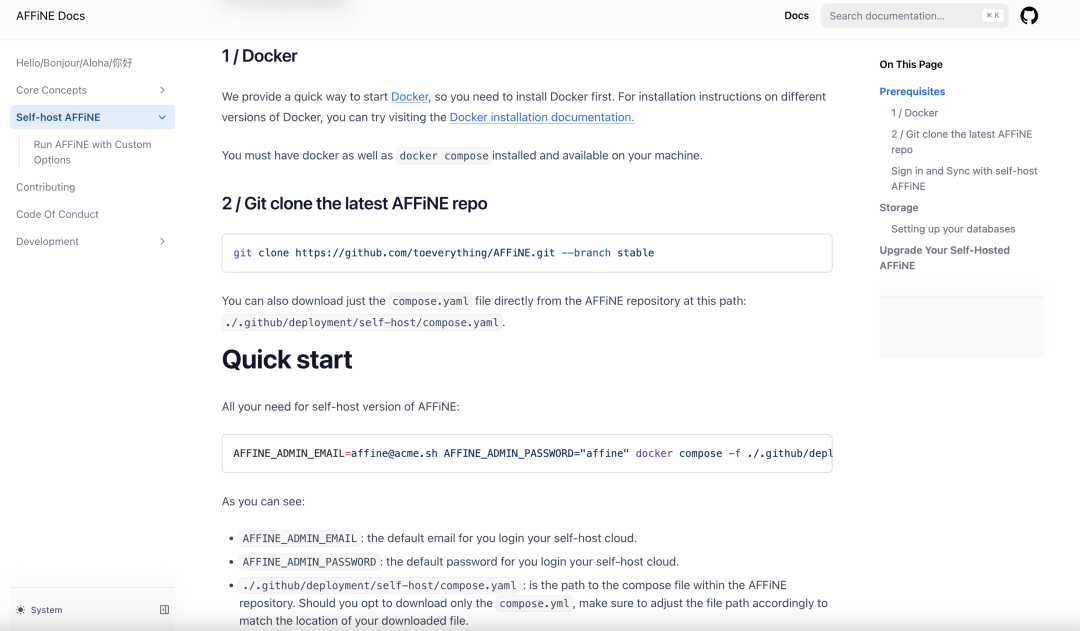 AFFiNE 支持 Docker 部署,用户可以轻松地启动自己的AFFiNE实例。详细的部署指南不一一罗列,读者可以在项目的 GitHub 仓库中找到指引文档。