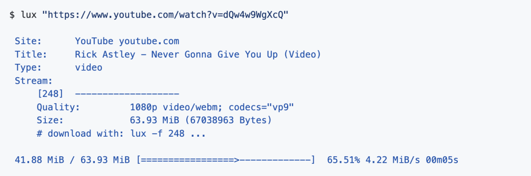 $ lux -f 248 "https://www.youtube.com/watch?v=dQw4w9WgXcQ"