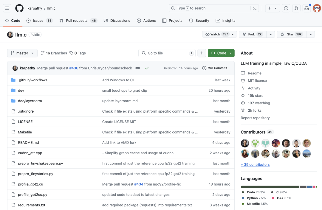 llm.c 是一个用纯C和CUDA编写的大型语言模型(LLM)训练项目。它的核心目标是提供一个简单、清晰的实现(仅仅 1000 行代码),让用户能够在不需要庞大框架支持的情况下,训练和理解GPT-2模型。