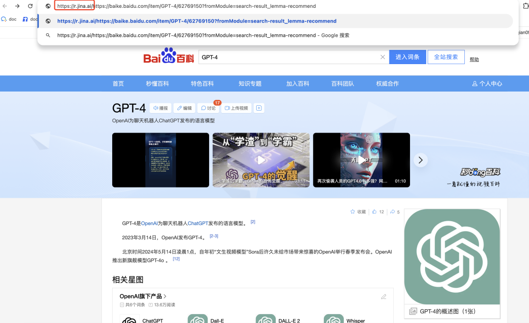 我在 GPT-4 的百度百科主页网址前添加 https://r.jina.ai/: