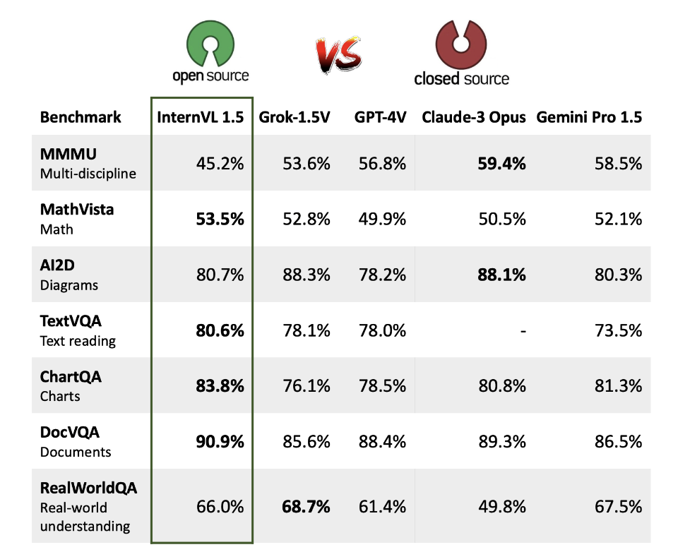 高性能:在多个基准测试中,InternVL-Chat-V1.5 接近 GPT-4V 和 Gemini Pro 的性能。