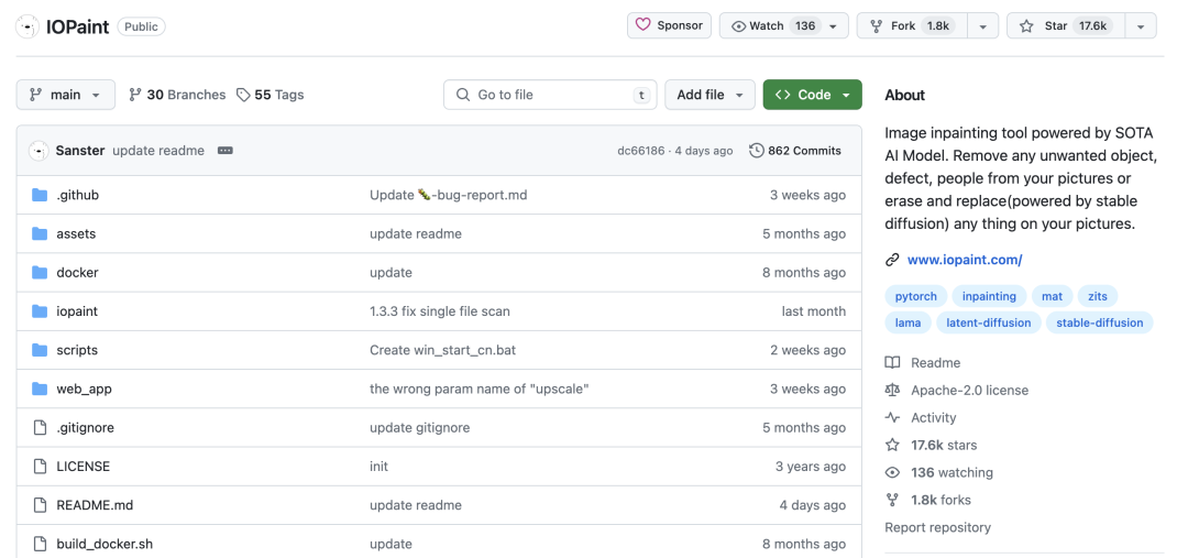 该项目由 Sanster 开发,目前已经获得了 17.6k 的 Star,可见这个开源项目相当受欢迎。IOPaint 就像一个强大的 AI 工具箱,满足从普通人到专业设计师的 PS 需求。