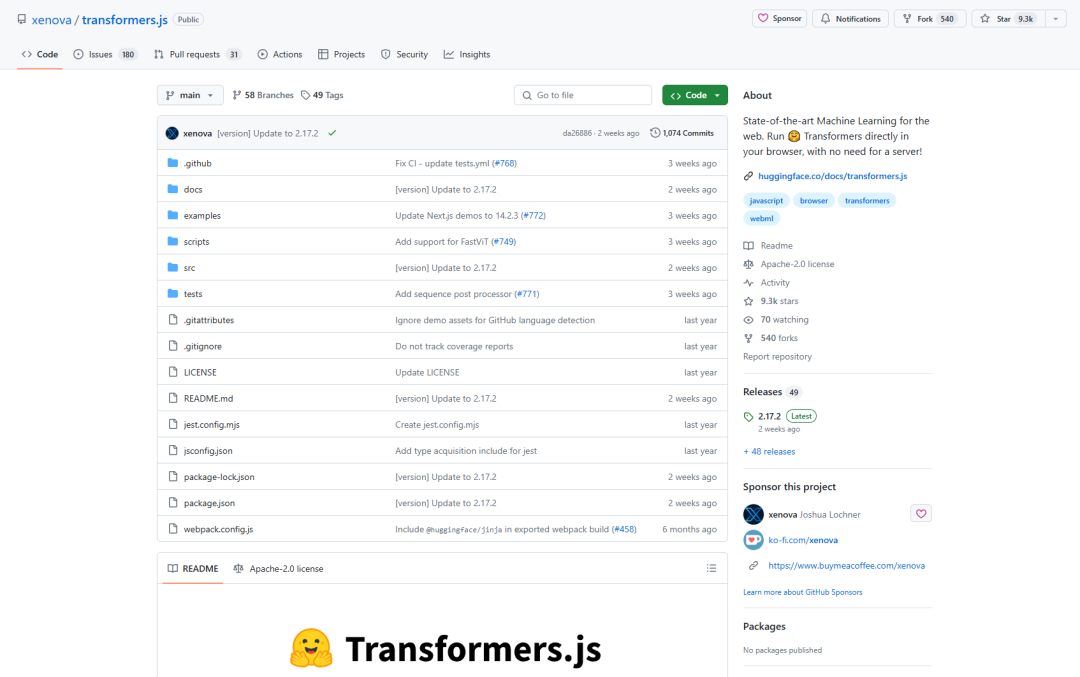 今天推荐的开源项目叫做 tansformers.js,这是一个不需要服务器端,能让你在浏览器上使用到自然语言处理、计算机视觉等 AI 能力的开源项目。由 xenova 开源,transformers.js 已经在 GitHub 上获得了超过 9.2K 颗星星。