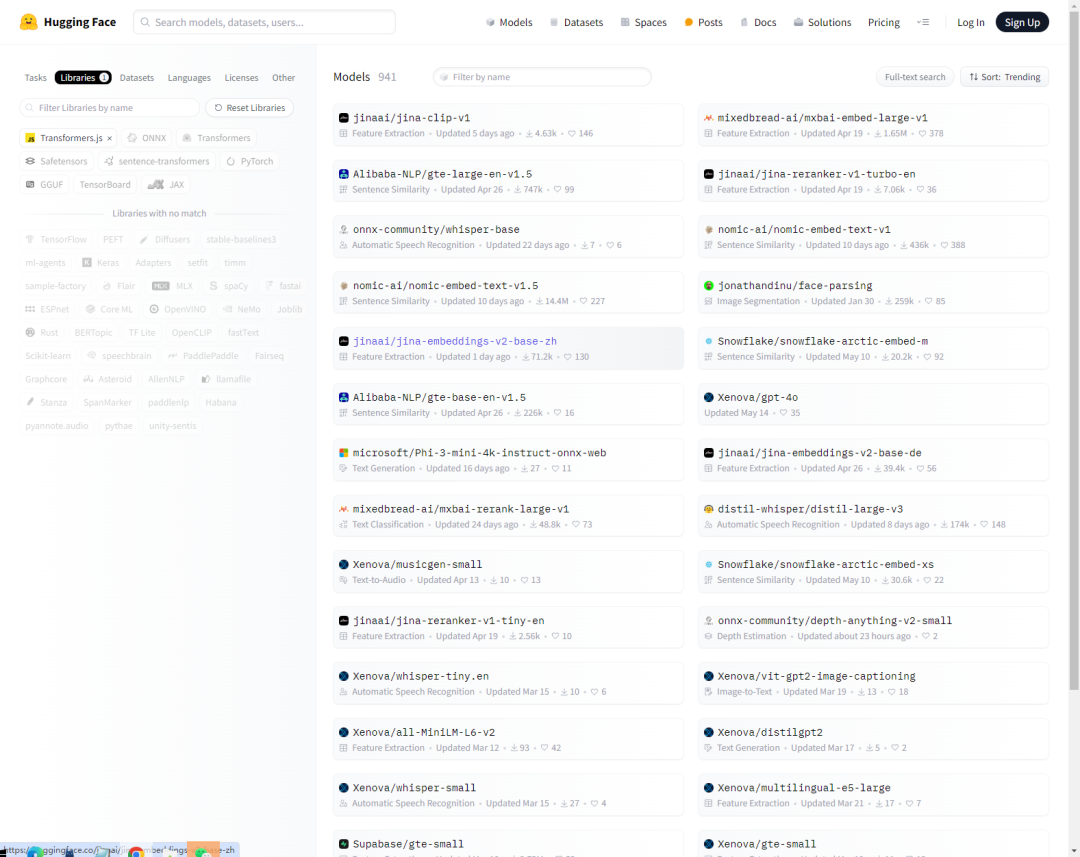 目前已经支持 941 个模型!huggingface.co/models?library=transformers.js