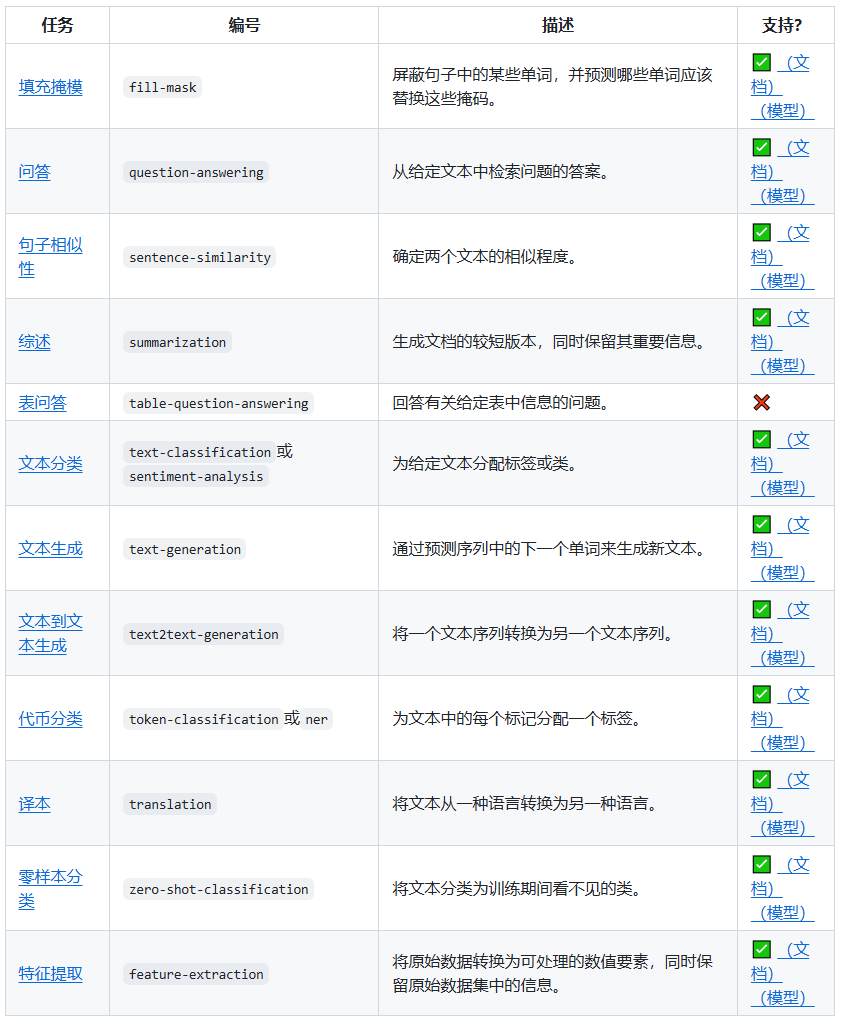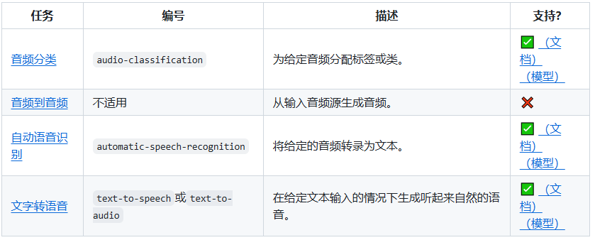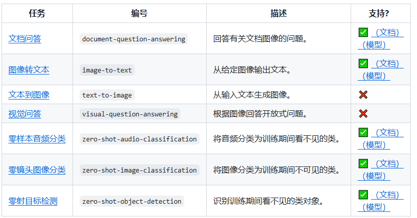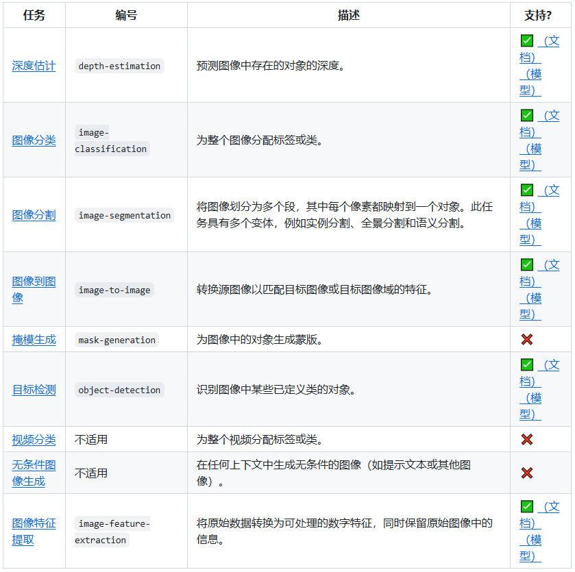 除此之外,如下是 Transformers.js 当前支持的所有任务和场景的列表: