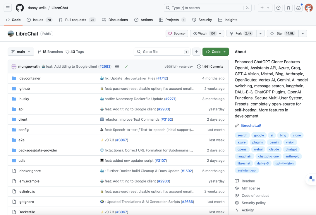 你部署了这个开源项目,你就会发现很像 ChatGPT,只不过功能更强大,更丰富。LibreChat 得到了来自全球开发者的广泛支持。项目 Star 数量已达到惊人的 14k,可见其受欢迎程度。