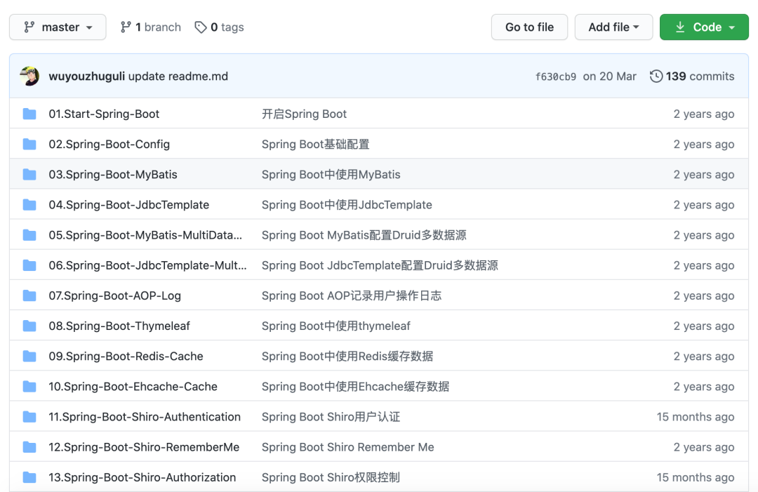 纯洁的微笑大佬的项目,他和程序员DD都是我非常喜欢的博主。这个项目 Spring Boot 使用的各种示例,以最简单、最实用为标准,此开源项目中的每个示例都以最小依赖,最简单为标准,帮助初学者快速掌握 Spring Boot 各组件的使用。
