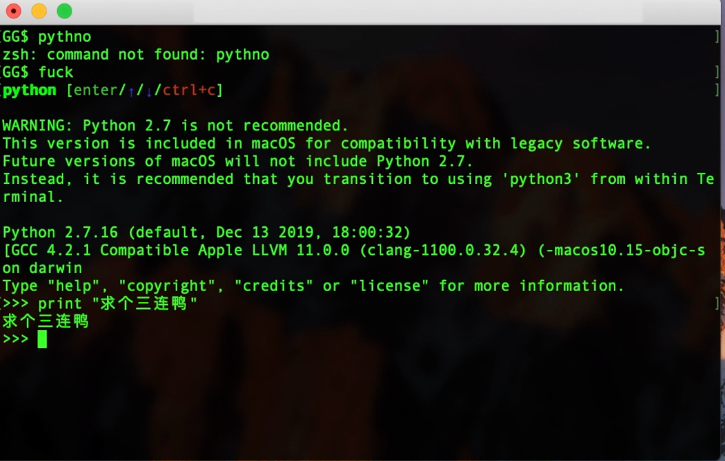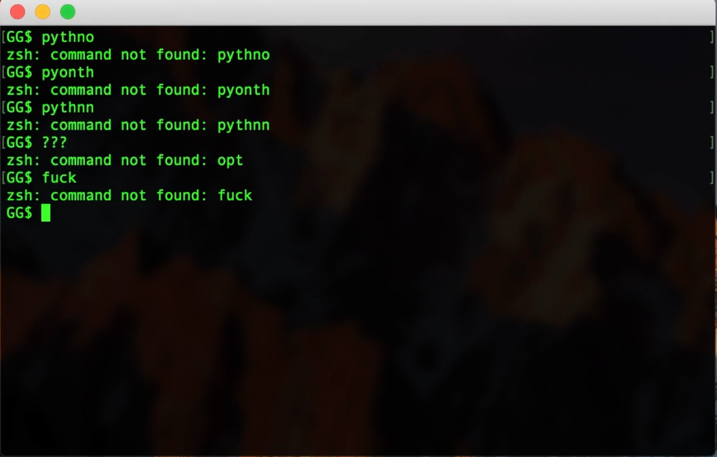 但是我昨天逛 GitHub 的时候,发现了一个神器:thefuck,这个神器就像专门为你们定制的,当你敲错命令时,只要大喊一声 fuck ,并输入 fuck 命令,你刚刚键入的错误命令就会自动修正。