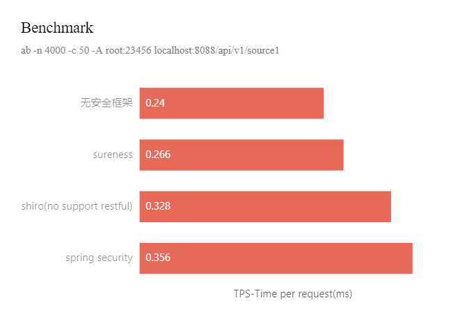 下图是基准测试,结果显示 无权限框架应用损耗 0.026ms 性能,shiro 损耗 0.088ms, spring security 损耗 0.116ms, 相比之下 sureness 基本不消耗性能,且性能是 shiro 的 3 倍,spring security 的 4 倍。