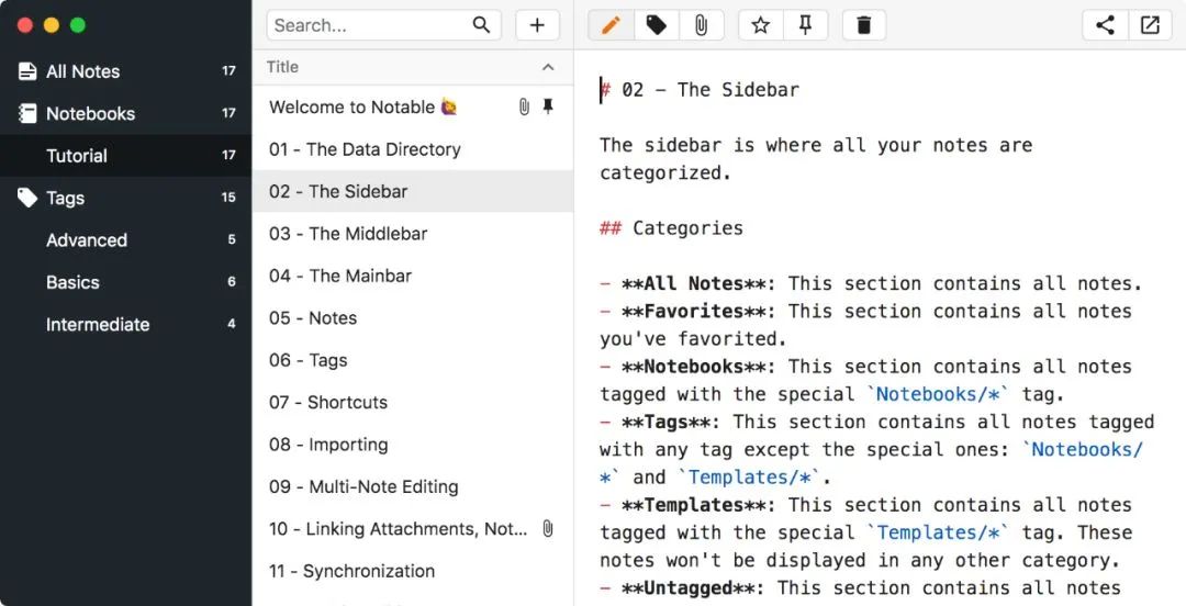 Notable 支持 Linux、FreeBSD、MacOS、Windows7 等主流操作系统,实际上它与 VS Code 所使用的编辑器相同,因此内置了多光标,小地图和一流的语法高亮等功能。