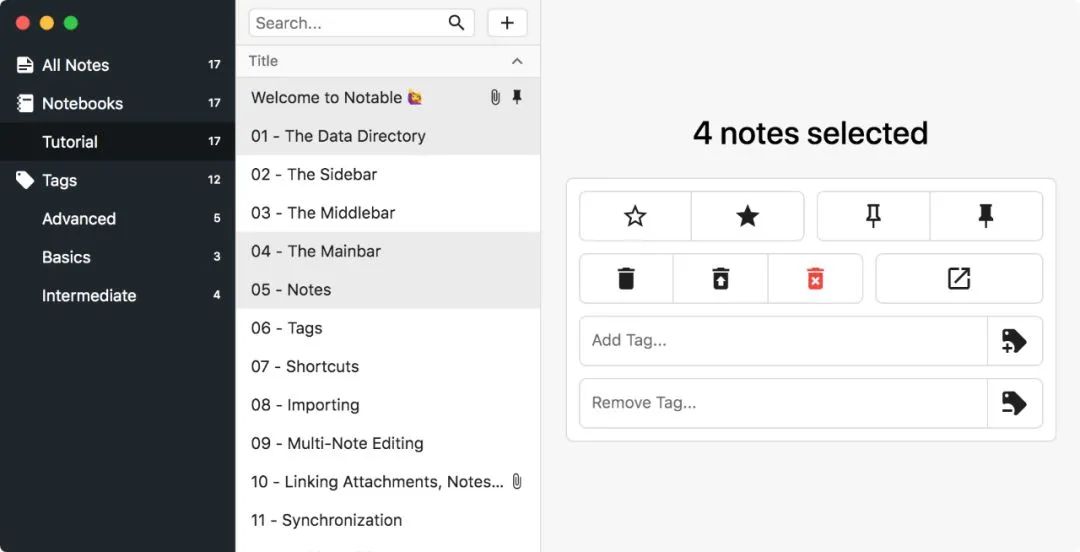 多笔记编辑可用于一次对多个笔记快速执行动作,如收藏,固定,删除,标记等。